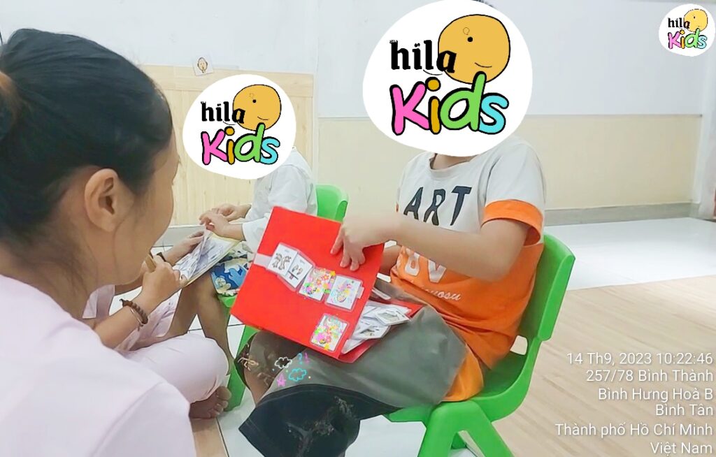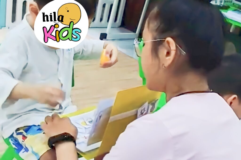 Trẻ chậm nói đang can thiệp tại HILA KIDS bằng sổ giao tiếp